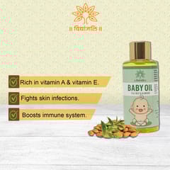 This rich ayurvedic massage oil is made with 7 skin nourishing oils and 6 essential oils. Sesame oil (Til ka tel), Olive oil (Jaitun ka tel), Coconut oil (nariyal ka tel) and wheat germ oil are natural skin moisturizers. Almond oil is rich in vitamin A & E. Tea tree and Cinnamon Essential oil boosts the immune system, increases blood circulation and fights skin infections. Eucalyptus (Nilgiri tel), Nutmeg (Jaifal tel) and Thyme (Ajwain tel) essential oils clear mucus from the respiratory tract, fight cough and cold and strengthen muscles and joints. The aroma from lemon oil that arises during massage purifies the surrounding air and acts as a disinfectant. This age-old ayurvedic recipe for baby massage nourishes the baby’s skin from within and has profound therapeutic benefits.