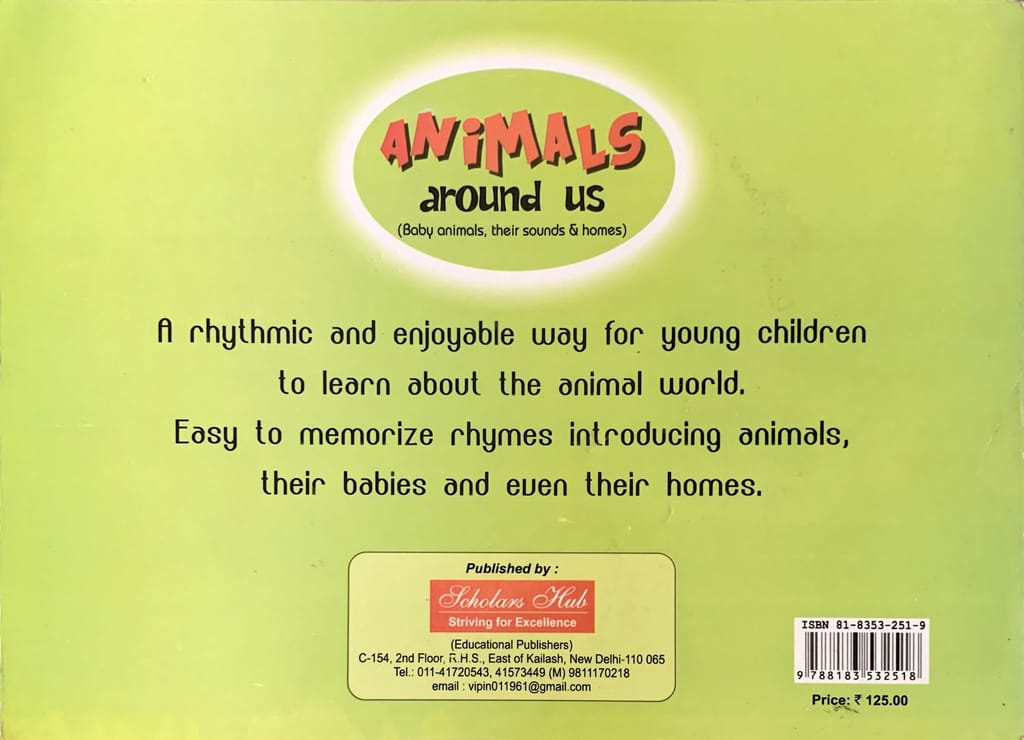 9.79E+12 607725f39b848c277f149ec1 Animal around us. https://www.bharatstores.com/s/5ed62b7c7d6b149e50662cc4/68d1772cb4a6fc63ec5037b7/2021-02-15-144307.jpg A rhythmic and enjoyable way for young children to learn about the animal world. Easy to memorize rhymes introducing animals, their babies and even their homes. SH-162