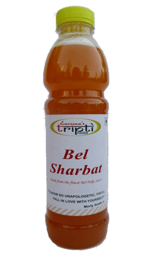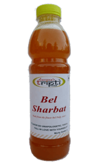 "??? ?????" or wood apple, is a typical north Indian fruit also used for worship in hindu religion, specially made by nature for extreme summers. At Tripti, finest bel is taken, pulp is extracted properly, then blended with sugar syrup. Bel is a rich source of vitamin and proteins, specially used for curing dysentery, supports in boosting immune system and preventing stomach related problems as well. Since this is made with original pulp, no colour and essence are needed to be added. Take one fourth measure of bel sherbet in a glass, mix well with cold water. Tastes joyfull if mint leaves and black salt is added. Taste the perfect blend of purity.