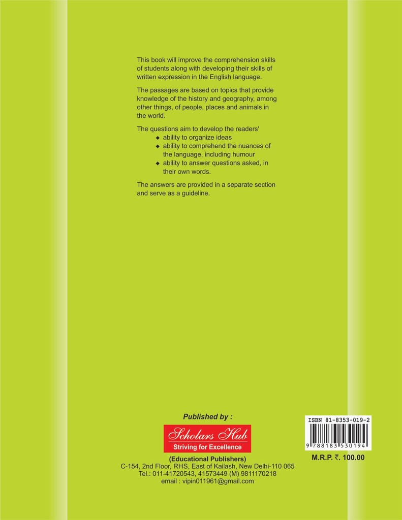 9.79E+12 5fff30d4202203cc4c8259a4 Comprehension-4. https://www.bharatstores.com/s/5ed62b7c7d6b149e50662cc4/68d1749e04bca071c15ee2aa/comprehensionpercent204percent20-percent20front.jpg The books will improve the comprehension skills of students along with developing their skills of written expression in the English language. The passages are based on topics that provide knowledge of the history and geography, among other things, of people, places and animals in the world. SH-76
