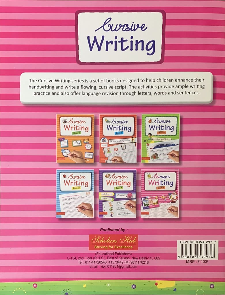 9.79E+12 5fff30a296e4adcc5230095e Cursive Writing-5. https://www.bharatstores.com/s/5ed62b7c7d6b149e50662cc4/68d175a904bca071c15ee5bf/cursivepercent205.jpg The Cursive Writing book is designed to help children enchance their handwriting and write a flowing, cursive script. The activities provide ample writing practice and also offer language revision through words and sentences. SH-08