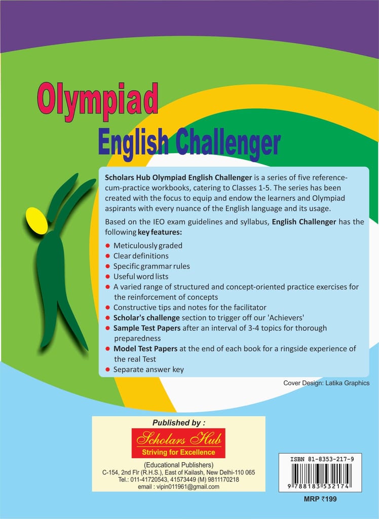 The series has been created with the focus to equip and endow the learners and Olympiad aspirants with every nuance of the English language and its usage. Based on the IEO exam guidelines and syllabus, Olympiad English Challenger has the following key features: Meticulously graded Clear definitions Specific grammar rules Useful word lists A varied range of structured and concept-oriented practice exercises for the reinforcement of concepts Constructive tips and notes for the facilitator Scholar's challenge section to trigger off our 'Achievers' Sample Test Papers after an interval of 3-4 topics for thorough preparedness Model Test Papers at the end of each book for a ringside experience of the real Test Separate answer key