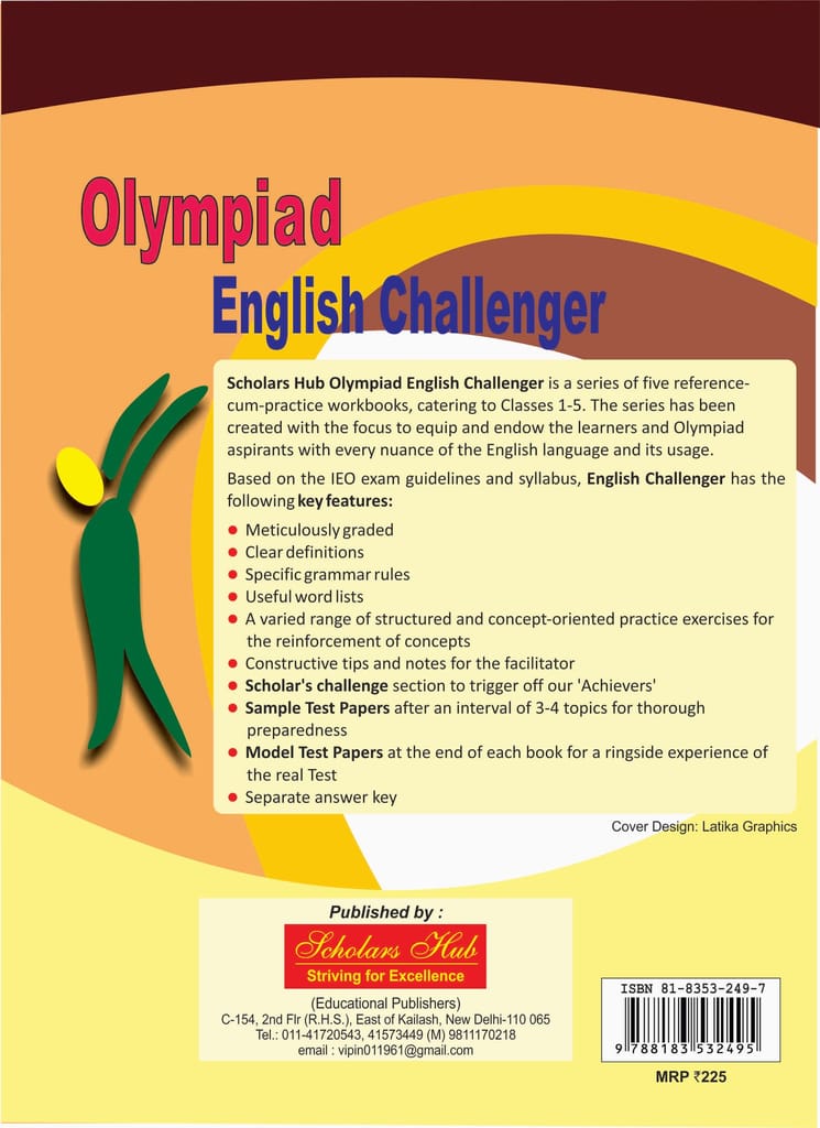 The series has been created with the focus to equip and endow the learners and Olympiad aspirants with every nuance of the English language and its usage. Based on the IEO exam guidelines and syllabus, Olympiad English Challenger has the following key features: Meticulously graded Clear definitions Specific grammar rules Useful word lists A varied range of structured and concept-oriented practice exercises for the reinforcement of concepts Constructive tips and notes for the facilitator Scholar's challenge section to trigger off our 'Achievers' Sample Test Papers after an interval of 3-4 topics for thorough preparedness Model Test Papers at the end of each book for a ringside experience of the real Test Separate answer key