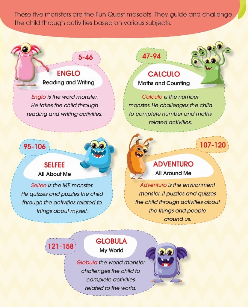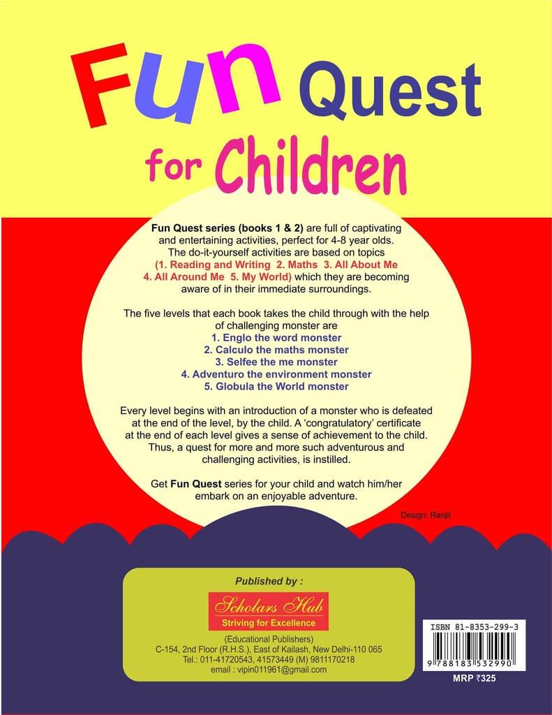 Fun Quest-1 is full of captivating and entertaining activities, perfect for 4-6 year olds. The do-it-yourself activities are based on topics (1. Reading and Writing 2. Maths 3. All About Me 4. All Around Me 5. My World) which they are becoming aware of in their immediate surroundings. The five levels that each book takes the child through with the help of challenging monster are 1. Englo the word monster 2. Calculo the maths monster 3. Selfee the me monster 4. Adventuro the environment monster 5. Globula the World monster Every level begins with an introduction of a monster who is defeated at the end of the level, by the child. A 'congratulatory' certificate at the end of each level gives a sense of achievement to the child. Thus, a quest for more and more such adventurous and challenging activities, is instilled. Get Fun Quest series for your child and watch him/her embark on an enjoyable adventure.