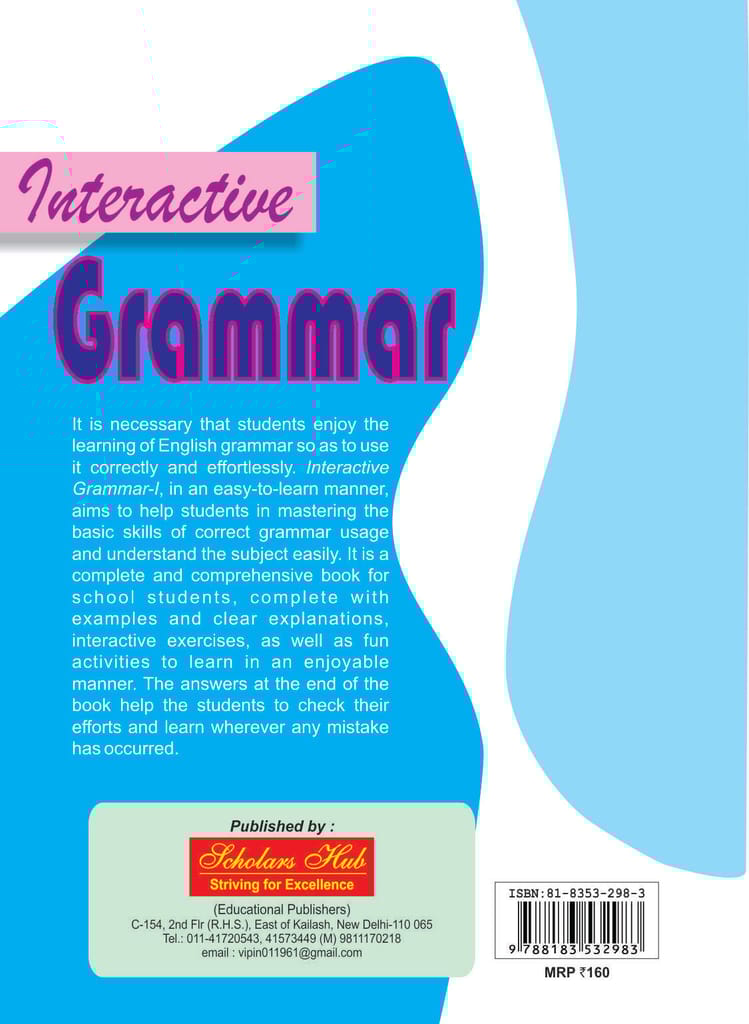 9.79E+12 5fff30db202203cc4c825a3f Interactive Grammar-5. https://www.bharatstores.com/s/5ed62b7c7d6b149e50662cc4/68d177b97fd53eef1ecde592/interactivepercent20grammarpercent205percent20-percent20front.jpg Interactive Grammar Series, in an easy-to-learn manner, aims to help students in mastering the basic skills of correct grammar usage and understand the subject easily. A comprehensive series for school students, complete with examples and clear explanations, interactive exercises, as well as fun activities to learn in an enjoyable manner. The answers in each book help the students to check their efforts and learn wherever any mistake has occurred. SH-83