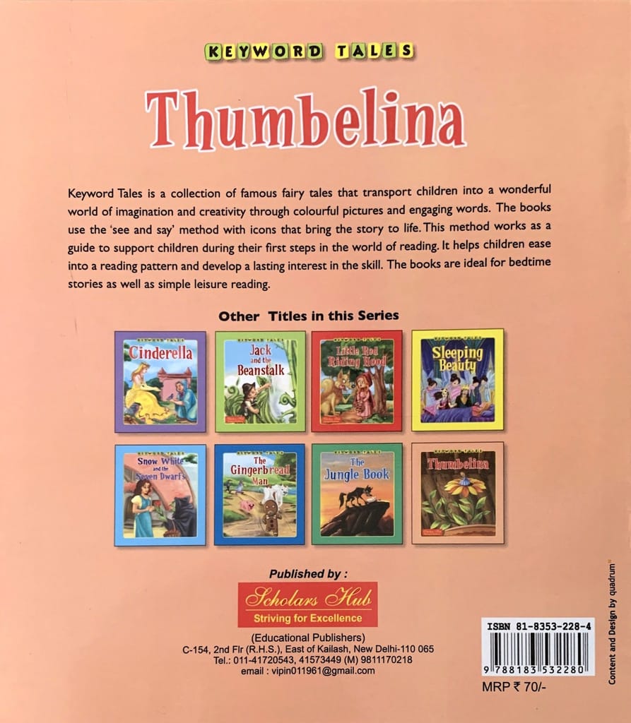 9.79E+12 6077262f9c9df0266904473e Keyword Tales-Thumbelina. https://www.bharatstores.com/s/5ed62b7c7d6b149e50662cc4/68d1766bb2694f3e2daabb58/2021-02-13-124112-3.jpg Keyword Tales is a collection of famous fairy tales that transport children into a wonderful world of imagination and creativity through colourful pictures and engaging words. The books use the see and say method with icons that bring the story to life. This method works as a guide to support children during their first steps in the world of reading. It helps children ease into a reading pattern and develop a lasting interest in the skill. The books are ideal for bedtime stories as well as simple leisure reading. SH-209