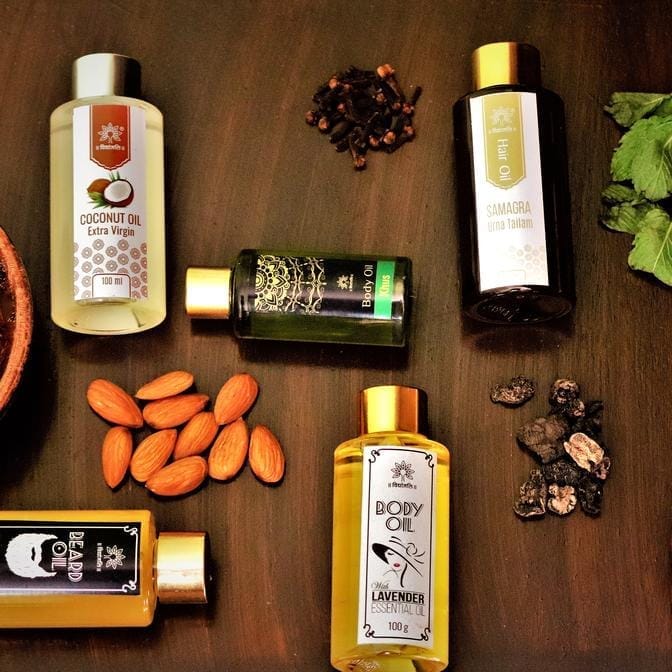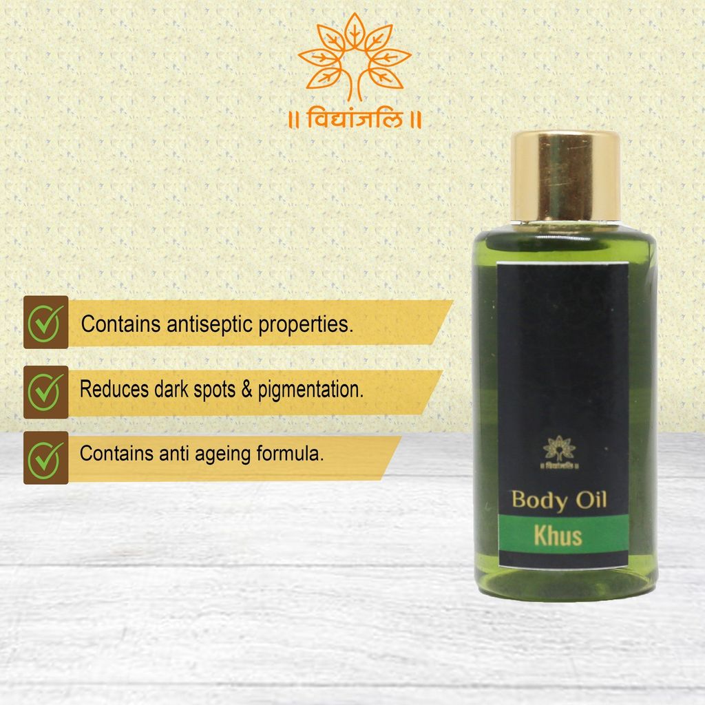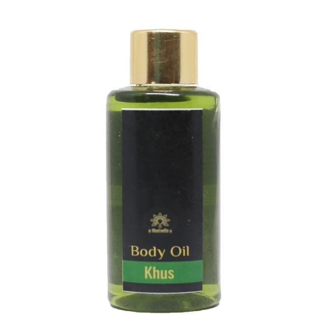Khus body oil has anti-inflammatory, antiseptic properties. It has the ability to reduce the dark spots and pigmentation marks on the skin. Khus oil helps skin appear firmer and more youthful. Blended with the goodness of almond, sesame, and other oils, it is the perfect combination to an anti-aging formula. The earthy scent of vetiver helps the body and mind to have a relaxing experience.