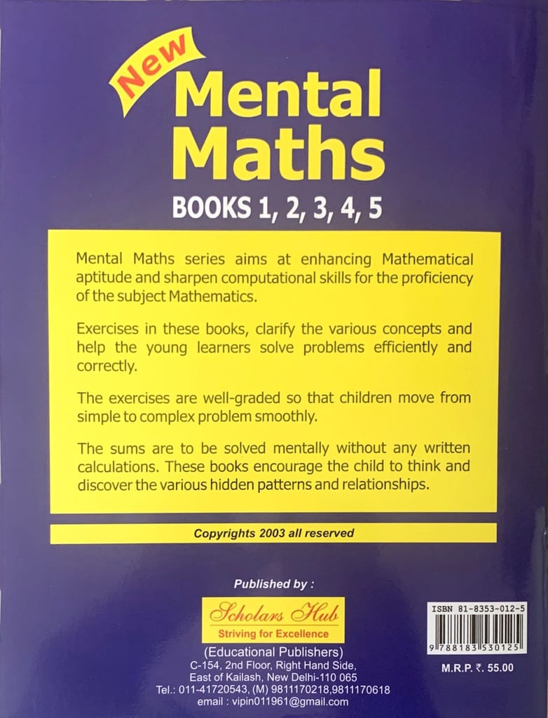 Mental Maths series aims at enhancing Mathematical aptitude and sharpen computational skills for the proficiency of the subject Mathematics. Exercises in these books, clarify the various concepts and help the young learners solve problems efficiently and correctly. The exercises are well-graded so that children move from simple to complex problem smoothly. The sums are to be solved mentally without any written calculations. These books encourage the child to think and discover the various hidden patterns and relationships.