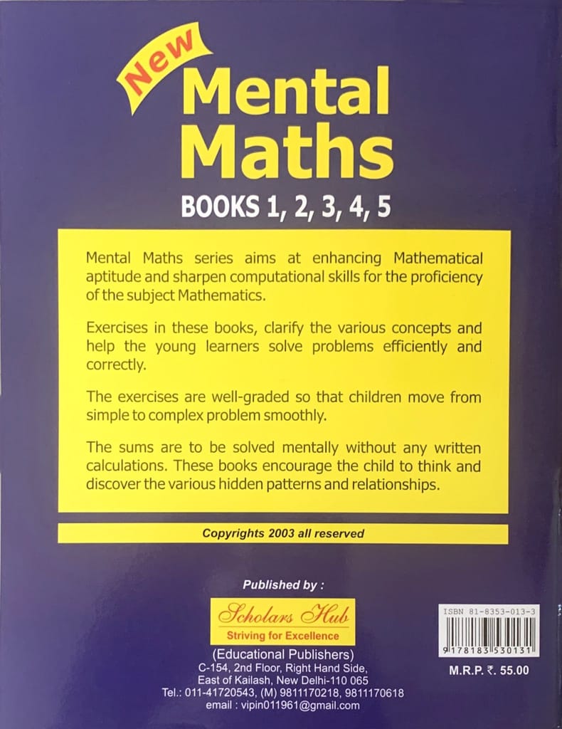 Mental Maths series aims at enhancing Mathematical aptitude and sharpen computational skills for the proficiency of the subject Mathematics. Exercises in these books, clarify the various concepts and help the young learners solve problems efficiently and correctly. The exercises are well-graded so that children move from simple to complex problem smoothly. The sums are to be solved mentally without any written calculations. These books encourage the child to think and discover the various hidden patterns and relationships.