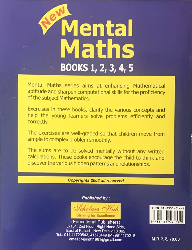 9.79E+12 5fff30bc202203cc4c8256ce Mental Maths-Vol 4 https://www.bharatstores.com/s/5ed62b7c7d6b149e50662cc4/68d17522a86f54a1d49ce14f/mentalpercent20mathspercent204.jpg Mental Maths series aims at enhancing Mathematical aptitude and sharpen computational skills for the proficiency of the subject Mathematics. Exercises in these books, clarify the various concepts and help the young learners solve problems efficiently and correctly. The exercises are well-graded so that children move from simple to complex problem smoothly. The sums are to be solved mentally without any written calculations. These books encourage the child to think and discover the various hidden patterns and relationships. SH-41