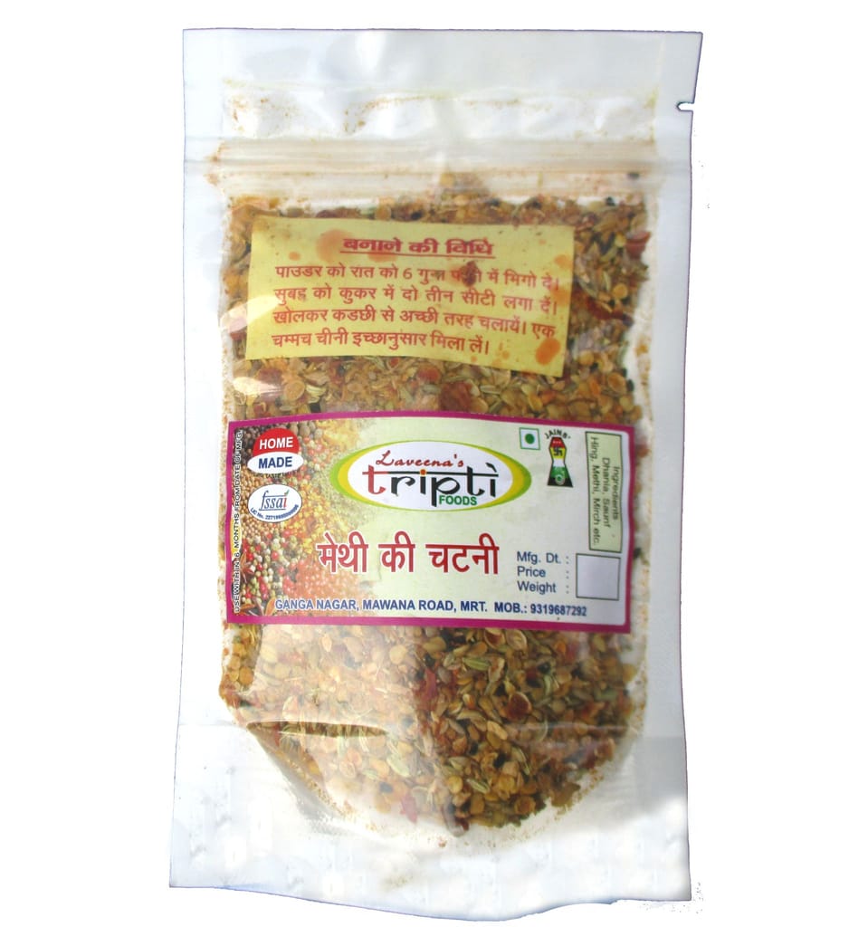 100% home made. Made after using cleaned Methi dana, drying it and then grounding it to make powder. All masale used are freshly ground at home. No preservatives used.