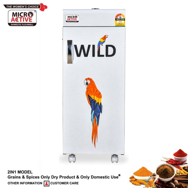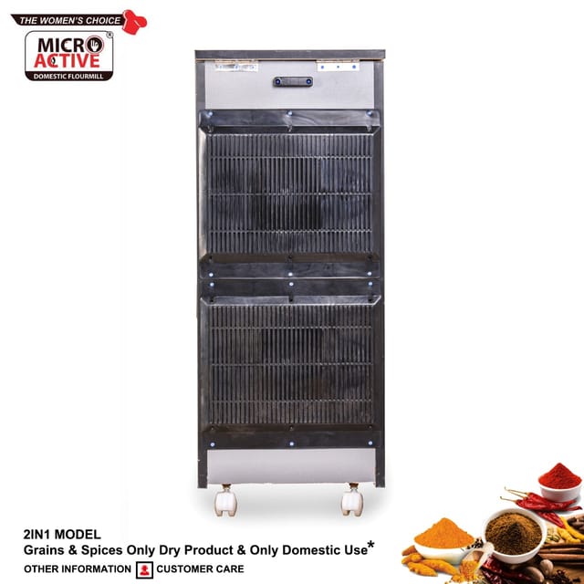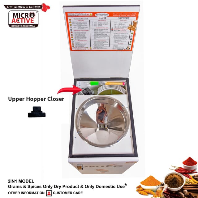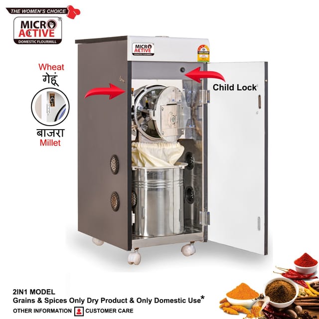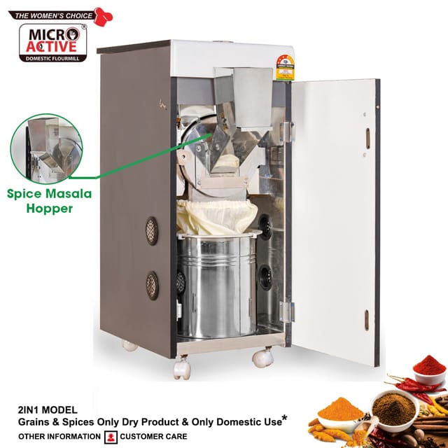 The 2 in 1 model from MICROACTIVE comes with Masala Attachment that can Grind everything Right from Wheat, Juvar, Millet, Rice etc along with Haldi (turmeric) and Red Chillies.