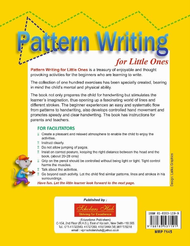 Pattern Writing for Little Ones is a treasury of enjoyable and thought provoking activities for the beginners who are learning to write. The collection of one hundred exercises has been specially created, bearing in mind the child’s mental and physical ability. The book not only prepares the child for handwriting but stimulates the learner’s imagination, thus opening up a fascinating world of lines and different strokes. The beginner experiences an easy and systematic flow from patterns to handwriting, also develops controlled hand movement and promotes speedy and clear handwriting. The book has instructions for parents and teachers.