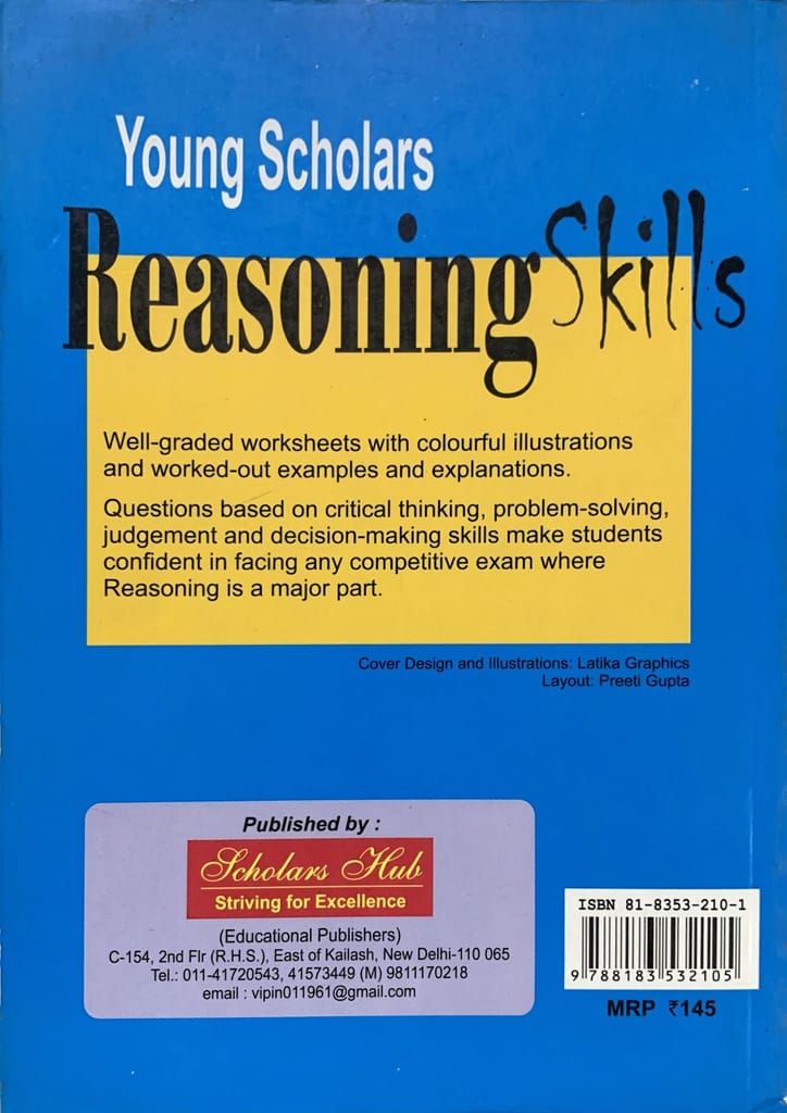 9.79E+12 6077260ccbd5266c9ef171c0 Young Scholars Reasoning Skills-2. https://www.bharatstores.com/s/5ed62b7c7d6b149e50662cc4/68d176dab2694f3e2daabbf4/2021-02-15-133241-4.jpg Well-graded worksheets with colourful illustrations and worked-out examples and explanations. Questions based on critical thinking, problem-solving, judgement and decisionmaking skills make students confident in facing any competitive exam where reasoning is a major part. SH-180