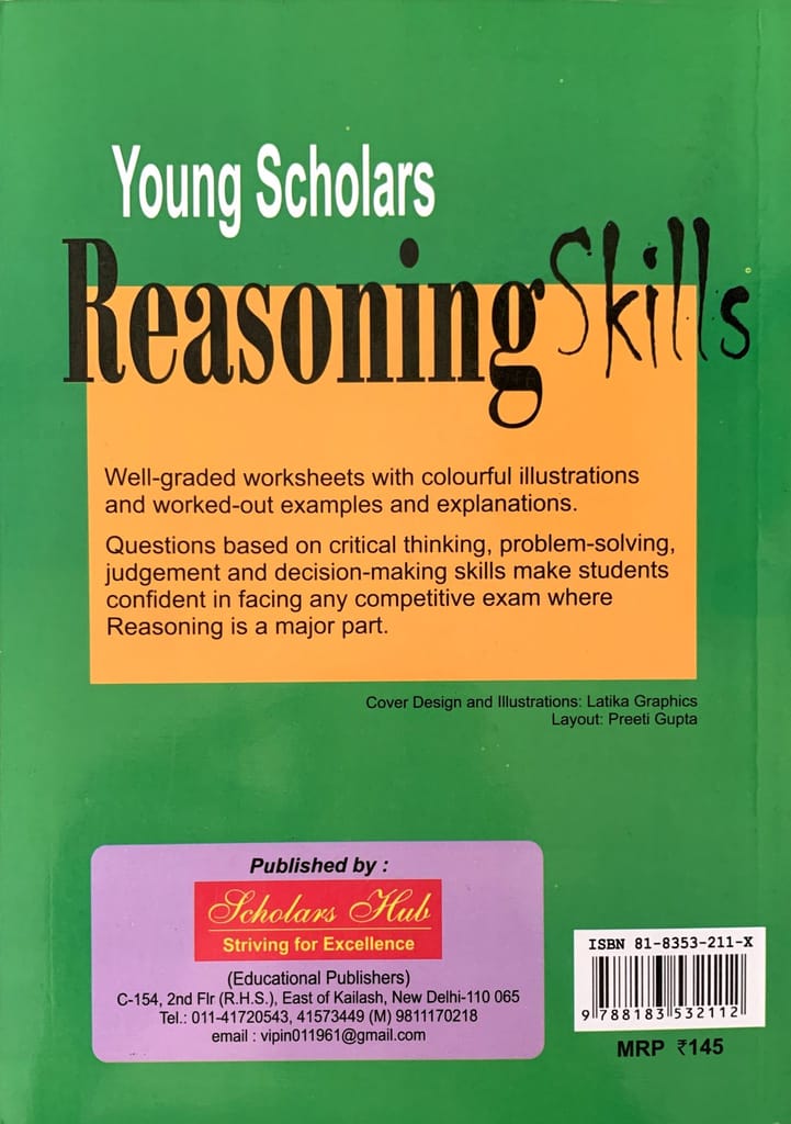9.79E+12 6077260c56531a6d1555b16e Young Scholars Reasoning Skills-3. https://www.bharatstores.com/s/5ed62b7c7d6b149e50662cc4/68d176dea86f54a1d49ce42f/2021-02-15-133241-6.jpg Well-graded worksheets with colourful illustrations and worked-out examples and explanations. Questions based on critical thinking, problem-solving, judgement and decisionmaking skills make students confident in facing any competitive exam where reasoning is a major part. SH-181